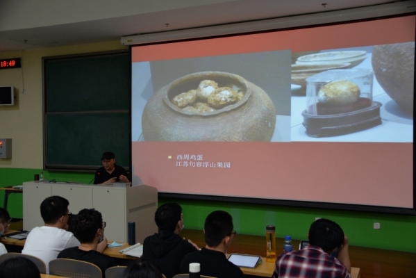 王老师明确认为,这类问题需要考古学来回答,并提出考古是有滋有味的历史,引得大家会心一笑。紧接着,王老师用翔实的考古资料来列举了一古代食物遗存,其中包括青海喇家遗址出土的世界最早的面条(距今四千多年,中科院地质所吕厚远研究员的研究,成果曾登上Nature杂志)、新疆苏贝希遗址出土的面条(国科大考古系杨益民教授、蒋洪恩教授的研究,曾入选2011年世界考古十大发现)、新疆阿斯塔拉遗址出土点心和饺子(唐代饺子,造型与今天别无二致)、三峡地区三国墓葬出土陶俑(其中展示了庖厨的操作场景,包括花边饺子)、长沙马王堆汉墓出土的烤肉串、烤鱼串、藕汤和鸡蛋、山西侯马出土的西汉早期鸡蛋、江苏句容出土的西周鸡蛋(是否为皮蛋或腌制蛋有待研究)、江西德安出土的宋代粽子(粽皮还十分完整,其防腐问题有待研究)、宁夏中卫出土的汉代红柳枝签烤肉串(红柳枝签在今天的新疆地区和一些新疆烧烤里仍然流行)、以及汉画像砖上的烤肉场景(烤肉工具与今天的几乎一样)。同学们大饱眼福之际,这场讲座也进入正题。![]()