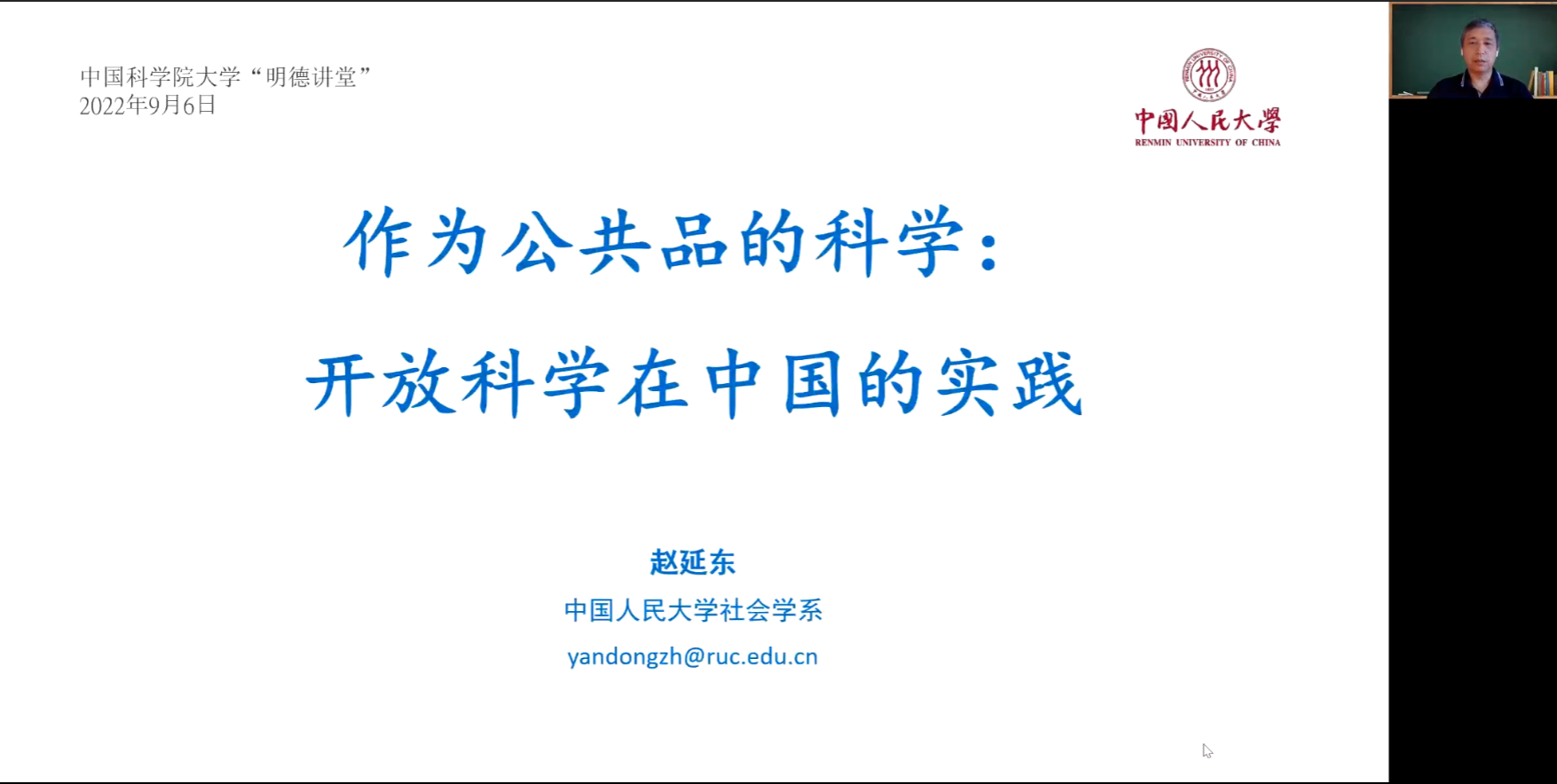 2022年9月6日,中国人民大学赵延东教授应永利3044noc莫扬教授邀请,在“开放科学”的主题下为全体国科大的员工带来了一次干货满满又开拓视野的讲座。尽管疫情影响的阴霾使得讲座改为线上,但丝毫不减同学们求知的热情,踊跃参与的同学人数甚至超过了视频会议的最大容量。在如此为难的情况下赵延东教授极尽体现了作为学者的大度与包容,他毫不犹疑地答应了可以进行录屏让更多同学参与其中,“开放科学当然是期望能有更多人从中启发受益,这个讲座也算是开放科学的实践。”信任满满的话音落下,虽然线上直播中听不到热烈如潮的掌声,但在很多同学心中都升起了不小的敬佩。