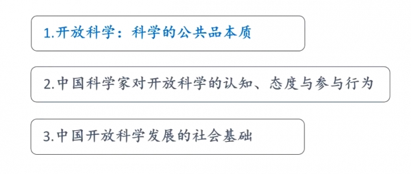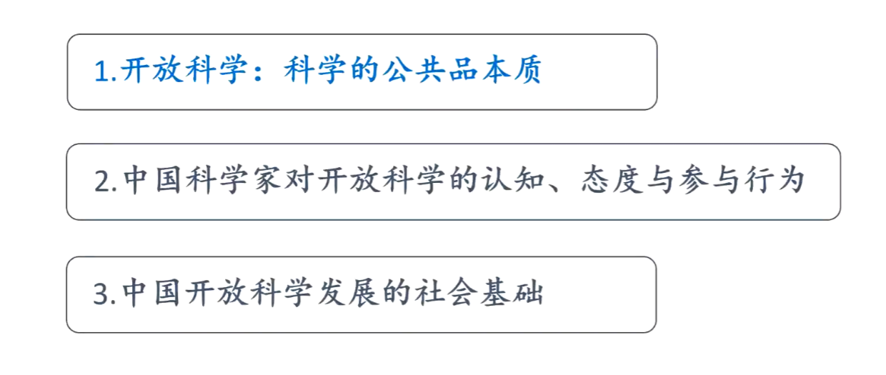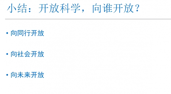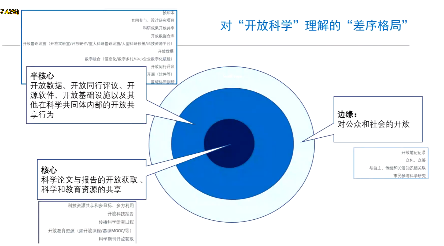 在下一阶段,赵老师以自身主持的对中国科学家和社会公众的大规模社会调查为依托,向同学们全面普及了中国科学家对开放科学的认知、态度与参与行为。,丰富的可视化数据让同学们直观感受到了中国科学界对开放科学的认知、态度和实践状况。经过对数据的呈现和分析,赵老师从中提炼出了中国科学界对开放科学认识的基本结构——来自社会学的经典理论“差序格局”,科学界对开放科学的认识层次以论文等资源共享为核心、然后向外依次递进到开放数据、同行评议和对社会与公众的开放。