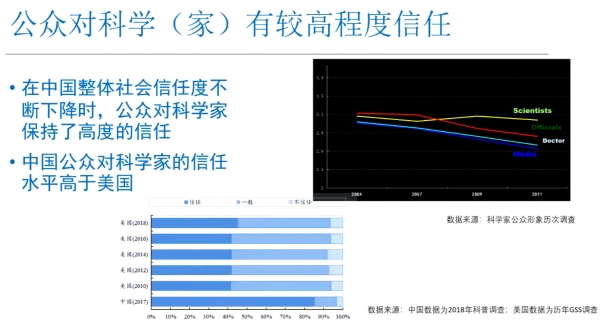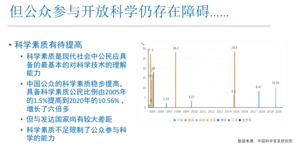 最后,赵老师分析了开放科学在中国发展的社会基础,对开放科学运动面临的挑战和未来发展的机遇也提出了探讨。随着互联网基础设施的普及,开放科学的物质基础越来越坚实,并且,经过调查发现,中国民众对科学界有着更多的信任、对开放科学有着较高的接受程度和更强的参与意愿;但另一方面,中国的公众科学素质虽然在今年来迅速提高,但相比发达国家仍然有较大差距,科学素质和基础素养的缺失是民众参与开放科学的主要障碍。