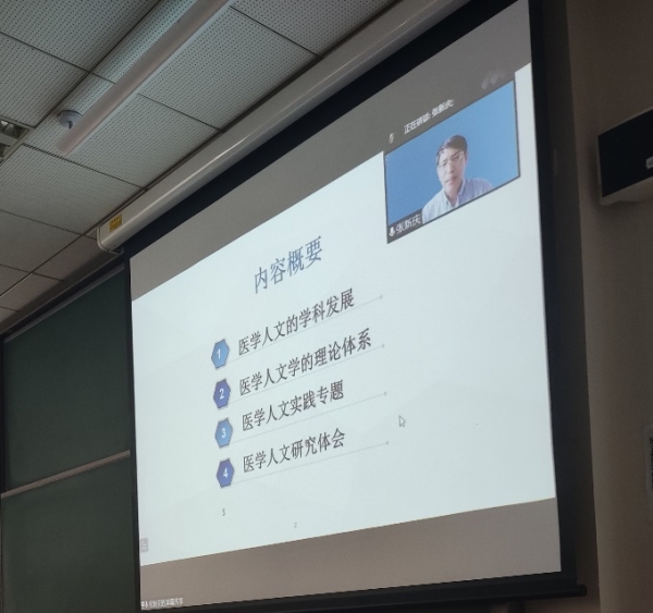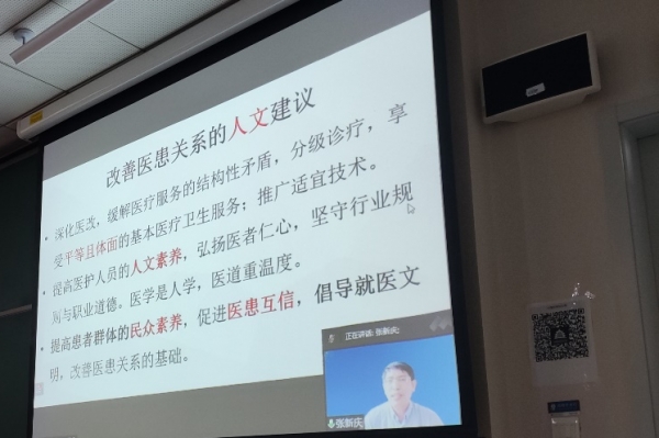 张老师从医学人文学的学科发展谈起,逐步深入到医学人文学的理论体系,再结合医学人文的实践主题,对这一学科进行了全面而详细的介绍;他更进一步,谈到了自身研究医学人文的研究体会,结合时事与实践,给同学们带来了更深的感触和认识。